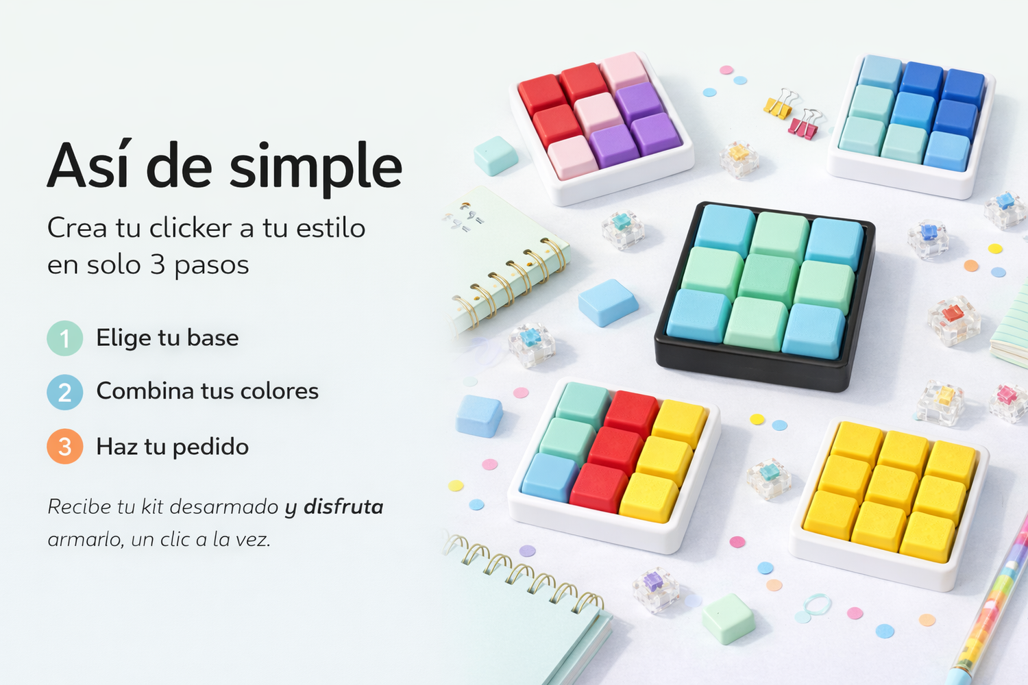 Elige colores, combina estilos y crea un clicker único para relajarte, jugar o regalar.